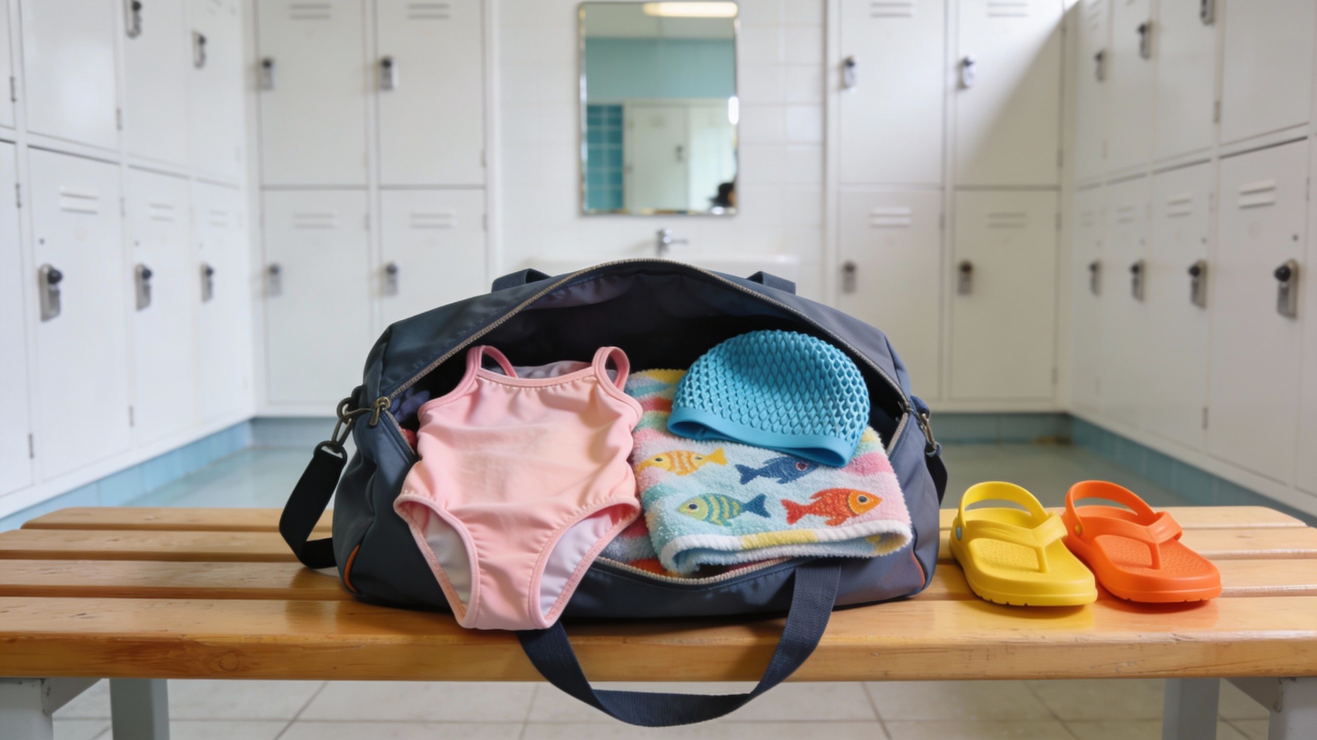 - Des claquettes ou sandales pour les déplacements dans les vestiaires et le bord du bassin.